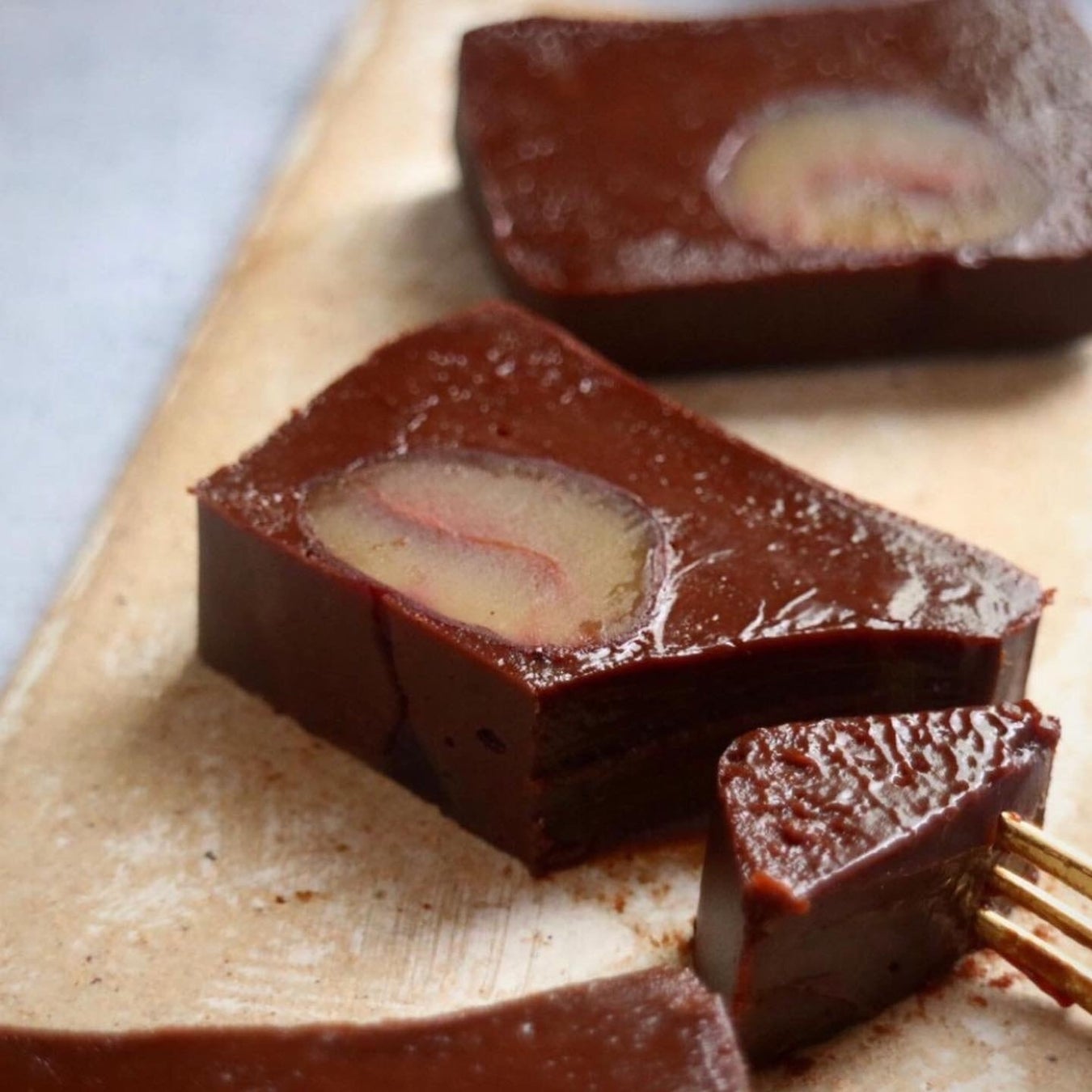 大粒の栗渋皮煮を包み込むように焼き上げ、チョコレートの濃厚な味わいととろけるような半生食感を存分にお楽しみください。