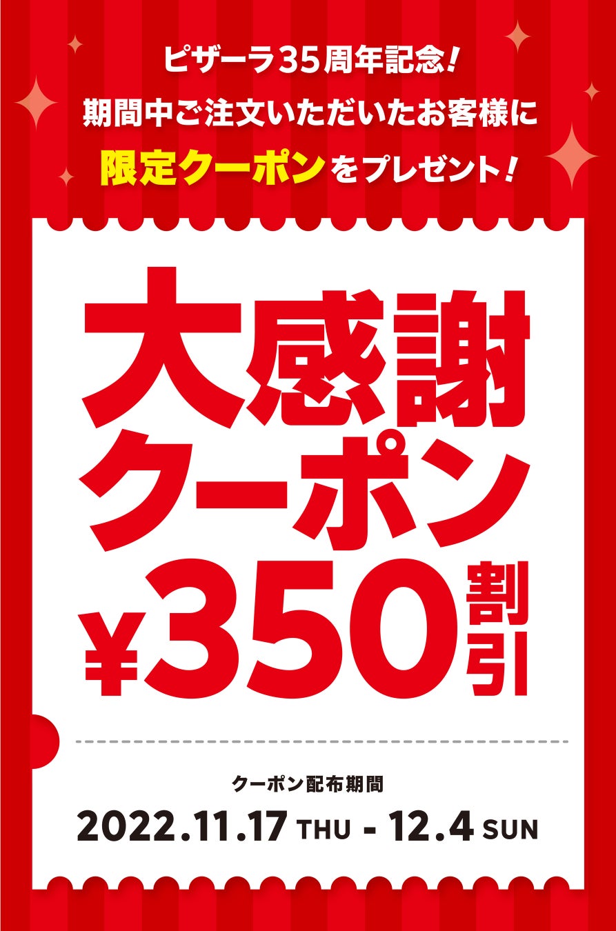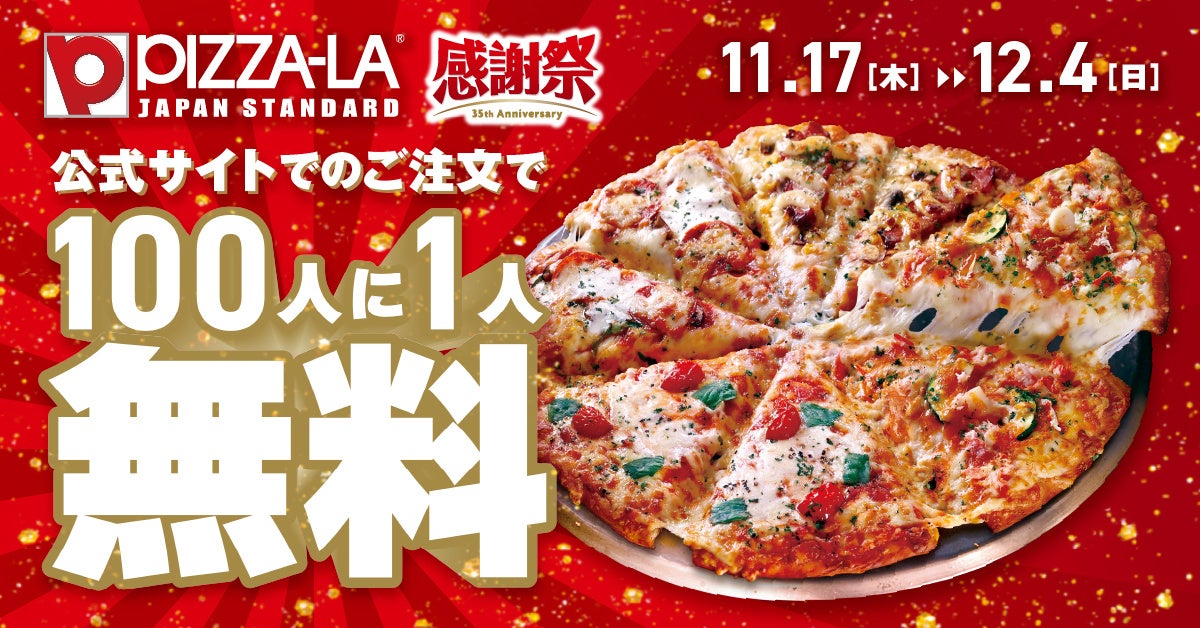 株式会社フォーシーズ(本社:東京都港区南青山 代表取締役社長:淺野幸子)が展開する宅配ピザ「PIZZA-LA」は、日ごろのご愛顧に感謝し、開業35周年記念「ピザーラ感謝祭」を11月17日(木)から実施いたします。