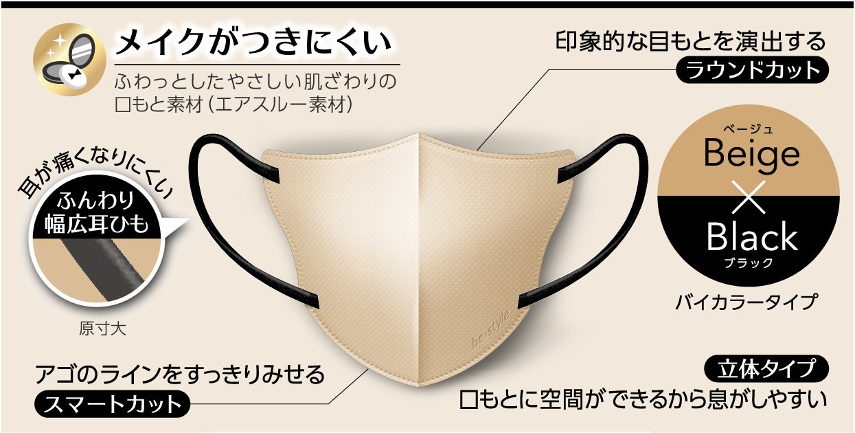「ビースタイル 立体タイプ」は、メイクがつきにくく、“小顔に見える”“フェイスラインがすっきり見える”と、マスク姿を素敵に見せたい皆様に好評をいただいています。また、小顔に魅せるマスク形状はもちろん、耳が痛くなりにくいふんわり幅広耳ひもや0.1μmの微小粒子をカットする不織布フィルターを採用し、ウイルス飛まつ、花粉、PM2.5対策もできるマスクです。