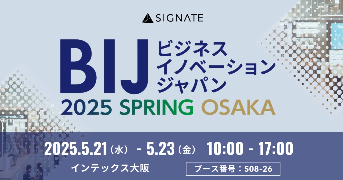 企業のDX推進を支援する株式会社SIGNATE(本社:東京都港区、代表取締役社長:齊藤 秀、以下「SIGNATE」)は、2025年5月21日(水)から5月23日(金)にインテックス大阪にて開催される「ビジネスイノベーション Japan 2025 春 大阪」に出展することをお知らせいたします。