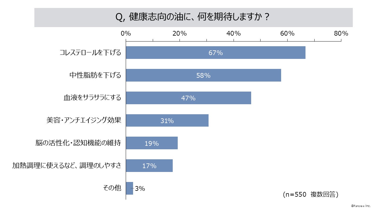 3.健康志向の油に期待することは「コレストロールを下げる」67%、「中性脂肪を下げる」58%
