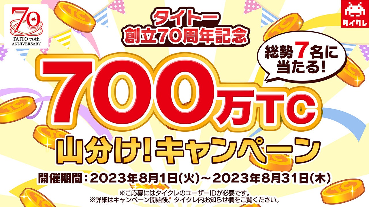 タイクレで遊べる『700万TC(タイトーコイン)』(約77万円(税込)相当)を総勢7名様に山分けいたします。