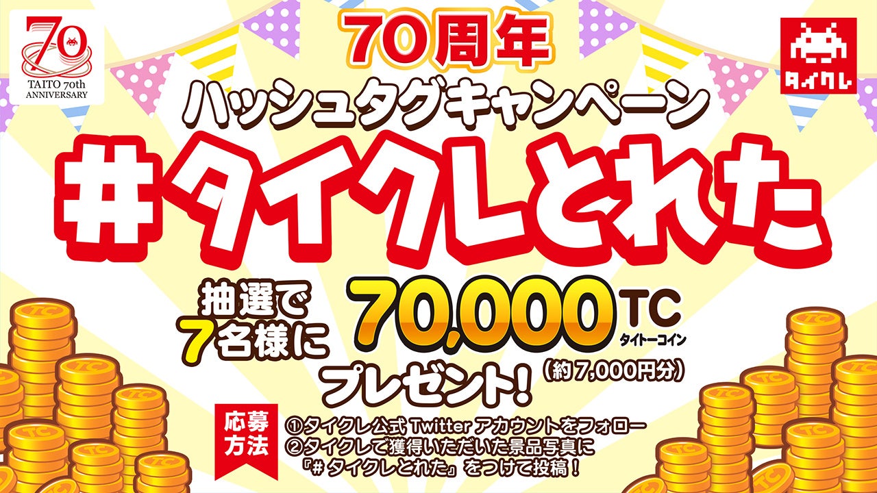 Twitterでハッシュタグ「#タイクレとれた」を付けてタイクレの獲得景品画像を投稿いただいた中から抽選で7名様に70,000TC(約7,700円(税込)相当)が当たるキャンペーンを開催いたします。