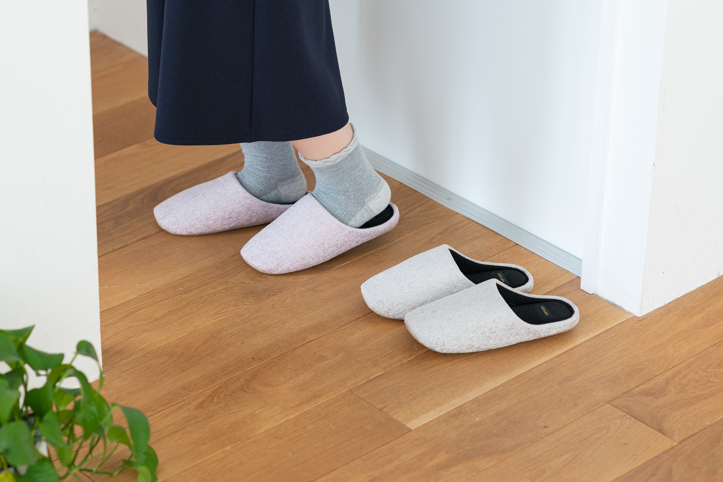 KEYUCAの人気シリーズ「足当たりふわりルームシューズ」として、半年ほど販売を続けていましたが、今期はお客様の声を受けて改良しました。少しサイズが大きくなって、より脱ぎ履きしやすくなりました。どんなサイズの方でもストレスがないので、お客様用スリッパとしてもおすすめです。甲が柔らかいため、かさばりにくく収納しやすいのもポイント。脱ぎ履きしやすい形状ながら、しっかりフィット感もある商品です。