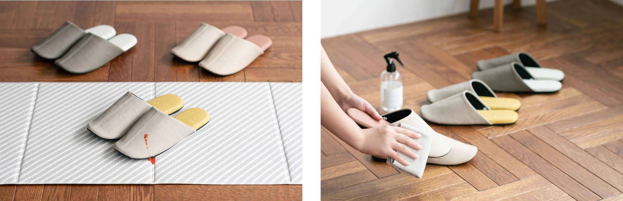約26,000足を売り上げた大人気スリッパが、Ag抗菌機能付でグレードアップし登場しました。新作では、日常的に衛生が重要視されている背景を受け、病院で使われている生地を採用しました。布生地のような見た目ですが、実は合皮を使用しており、さっと汚れが落ちやすいのでキッチンやトイレ用のスリッパとしてもおすすめです。また、アルコールや次亜塩素酸での除菌にも対応しています。撥水機能付きですが、見た目はしっかり布に見える生地なので、インテリアにもなじみます。