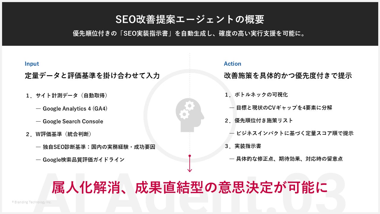 ブランディングテクノロジー株式会社(代表取締役社長:木村 裕紀、本社:東京都渋谷区、証券コード7067、以下当社)は、株式会社ジーニー(代表取締役社長:工藤 智昭、本社:東京都新宿区、証券コード6562)のグループ会社であるJAPAN AI株式会社(代表取締役社長:工藤 智昭、本社:東京都新宿区、以下、JAPAN AI)との資本業務提携に基づく共同開発プロジェクトの第三弾として、「SEO改善提案エージェント」を開発したことをお知らせします。