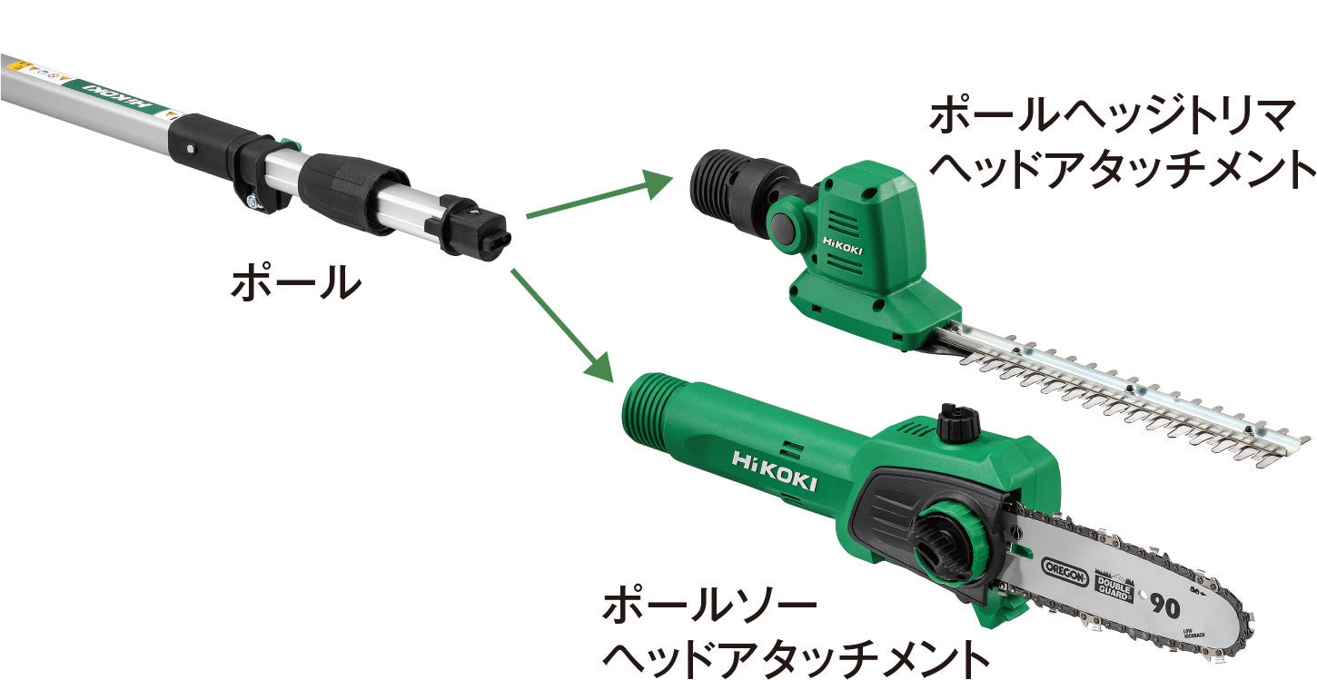 また両製品ともに、別売りのヘッドアタッチメント(先端ユニット)をポールヘッジトリマ/ポールソーに交換することができるため、どちらか一つの商品があれば、トリマ・ソーの両方を兼ね揃えた機能を得ることができます。