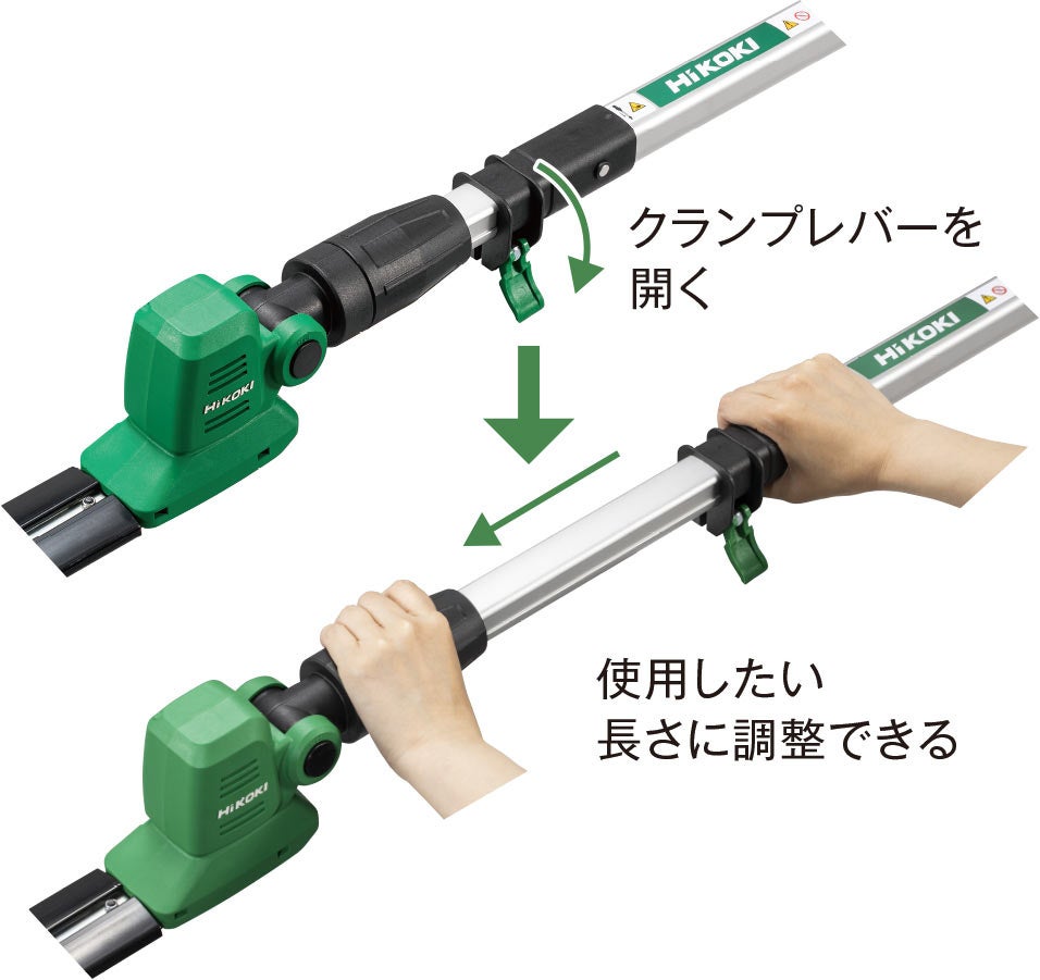 コードレスヘッジトリマCHP 1825DAとコードレスポールソーCSP 1820DAは、作業に合わせてパイプの長さ調整ができ,楽な姿勢での作業が可能となります。