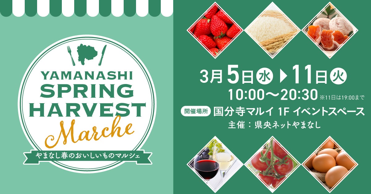 全国の農家や漁師などの生産者と消費者をつなぐ国内最大級の産直アプリ「ポケットマルシェ(ポケマル)」を運営する株式会社雨風太陽(本社:岩手県花巻市、代表取締役社長:高橋 博之、証券コード:5616、以下「当社」)は、国分寺マルイ1Fイベントスペースにて春の山梨の食材の魅力を伝えるマルシェ「Yamanashi Spring Harvest Marche」を 2025年3月5日(水)〜11日(火)の期間で開催します。山梨県の産地直送の特産品を購入することができるほか、購入者特典として、コシヒカリやフルーツトマトを500円でお得に購入できる割引券があたる抽選会への参加や、ポケマルクーポンの先着プレゼントを用意しています。