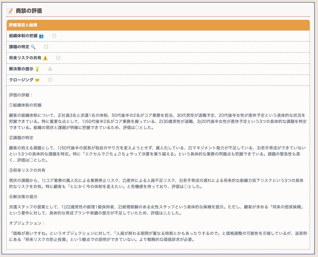 ManeAIは、商談データをもとに、AIが詳細なレポートとフィードバックを自動生成します。アークスリーではこの仕組みを活用し、各営業担当者が自身の商談を振り返りながら、AIからの指摘を日々の営業活動に反映させています。