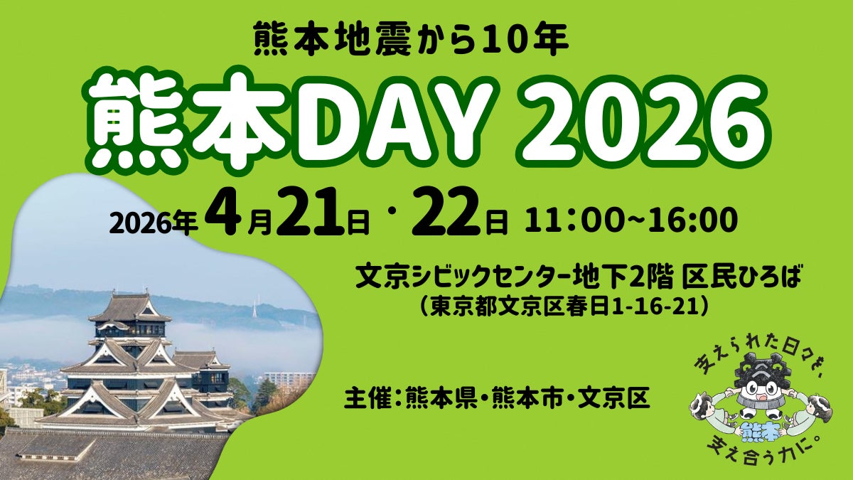 熊本市(市長:大西 一史)と熊本県・文京区は、令和8年(2026年)4月21日(火)・22日(水)の2日間、東京都文京区にある文京シビックセンター地下2階 区民ひろばにて、熊本地震から10年の節目としてパネル展&物産展『熊本DAY2026』を開催いたします。平成28年(2016年)熊本地震から10年、全国の皆さまの支援により、熊本は力強く復興いたしました。この経験と教訓や熊本と文京区の歴史や文化の繋がりを伝えるパネル展をはじめ、食のみやこ熊本県が誇るうまかもん(特産品)の販売、くまモンのステージイベント等を実施いたします。