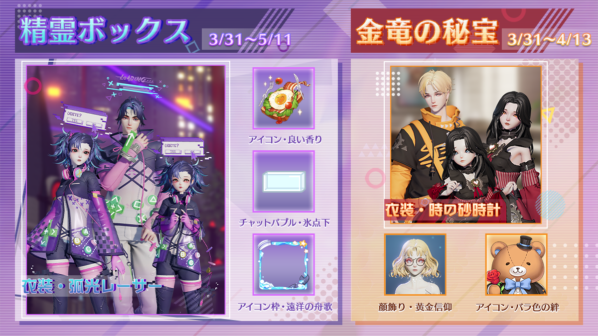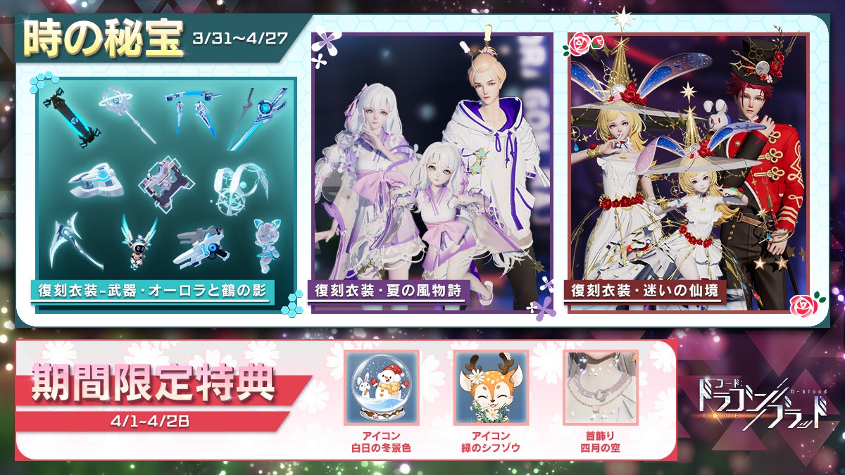 新たな限定パック特典「華麗なる衣裳特典」「神竜の加護特典」「ゲームマスター特典」が登場! パックを購入すれば、お得なレアアイテムが手に入ります。さらに、購入後に累計5日間ログインすれば、「アイコン・白日の冬景色」「アイコン・緑のシフゾウ」「首飾り・四月の空」などをゲットできます!