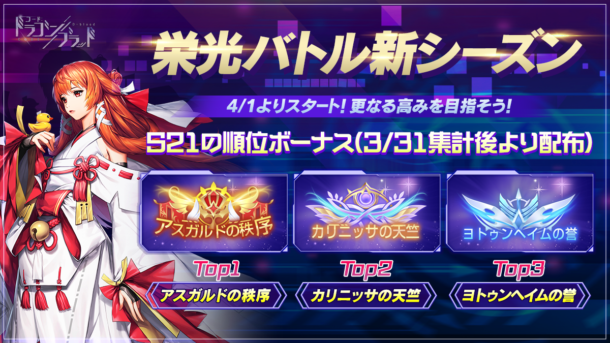 本日は、「栄光バトル」シーズン21の閉幕と報酬配布についてのご案内と間もなく開催される新シーズンについての情報をお届けします。さらに、新イベント「金竜の秘宝」の情報を始め、「限定セールパック」「精霊ボックス」「時の秘宝」「2周年期間限定特典」など新コンテンツ情報を一挙ご紹介いたします。プレイヤーの皆さん、お見逃しなく! そして、4月2日に新たな主題歌についての情報を公開をする予定であり、さらに4月9日2周年当日にはYouTubeにて公式生配信をお届けします! こちらもご期待ください!