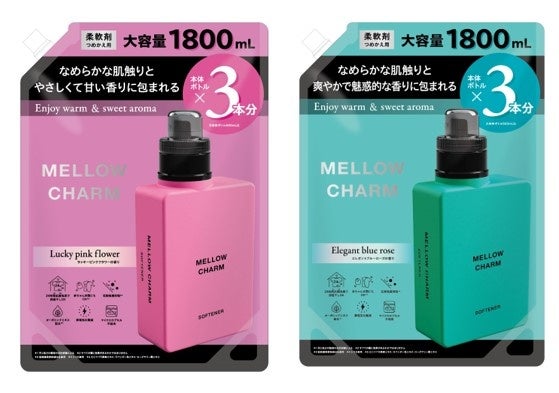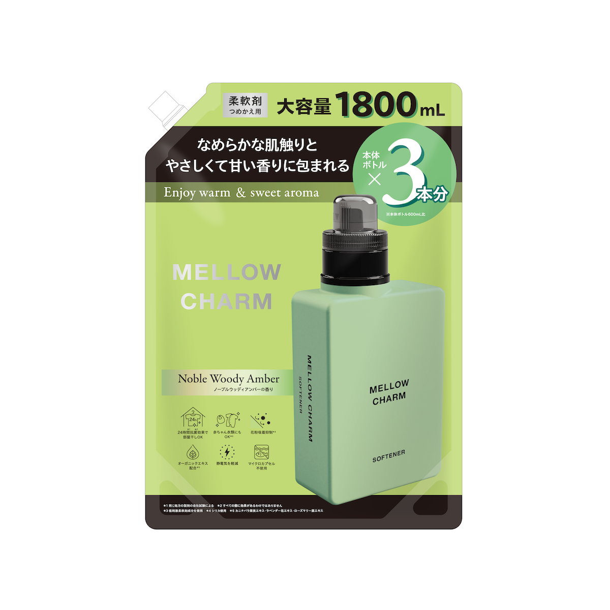 ※1 一部取り扱いのない店舗もございます ※2 同じ処方の製剤の自社試験による ※3 すべての菌に効果があるわけではありません ※ 4低刺激柔軟剤成分を使用 ※5 エステル型ジアルキルアンモニウム塩使用 ※6 シリカ使用 ※7 すべてのニオイ・菌に効果があるわけではありません ※8 メロウチャームブランド全シリーズ累計出荷実績、2025年12月末時点