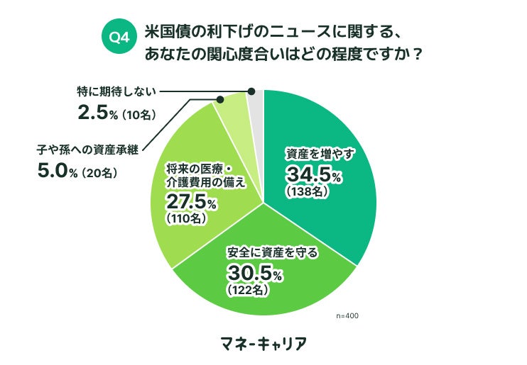 調査の結果、「関心がある」と回答した方は合計で309名(77.3%)であり、米国債の利下げに関する関心度合いが非常に高いことがわかりました。