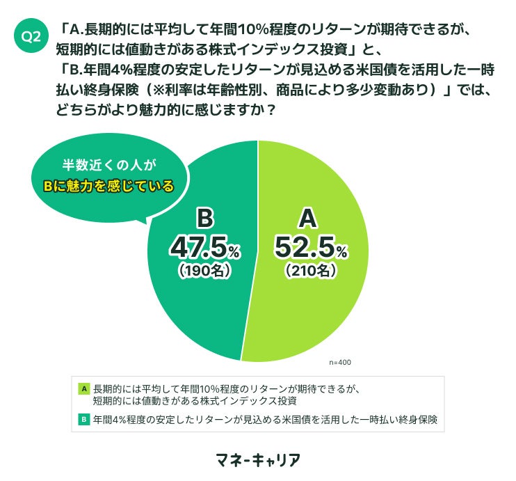 <Q2.「A.長期的には平均して年間10%程度のリターンが期待できるが、短期的には値動きがある株式インデックス投資」と、「B.年間4%程度の安定したリターンが見込める米国債を活用した一時払い終身保険(※利率は年齢性別、商品により多少変動あり)」では、どちらがより魅力的に感じますか?>