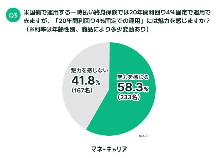 調査の結果、米国債で運用する一時払い終身保険の「20年間利回り4%固定での運用」(※利率は年齢性別、商品により多少変動あり)に魅力を感じている人は233名(58.3%)となり、半数以上の人が魅力に感じている結果となりました。