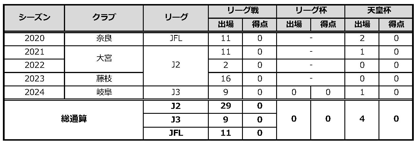 サッカー歴:奈良東和FC→京都サンガF.C.U-15→京都サンガF.C.U-18→関西学院大→奈良クラブ→大宮アルディージャ→藤枝MYFC→FC岐阜