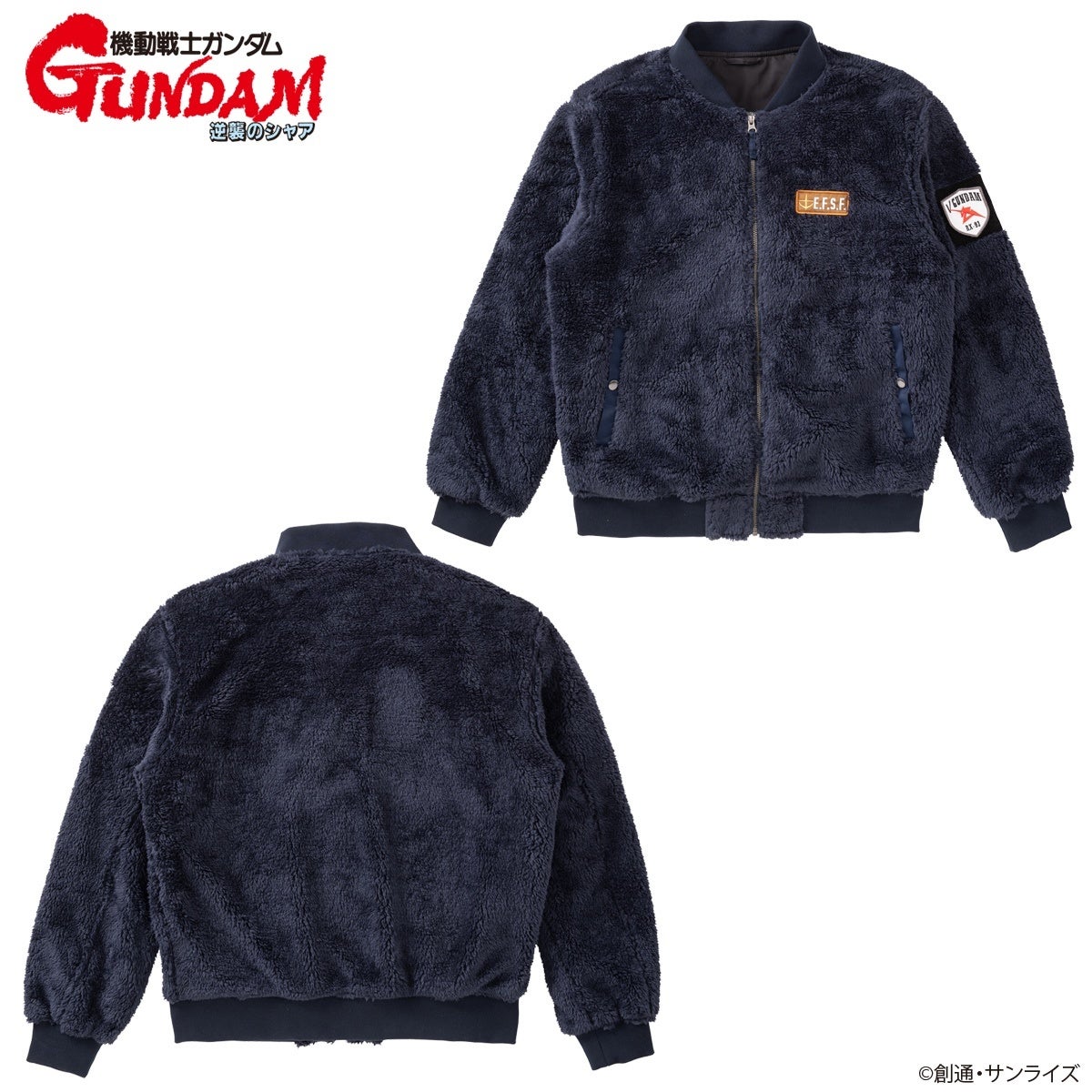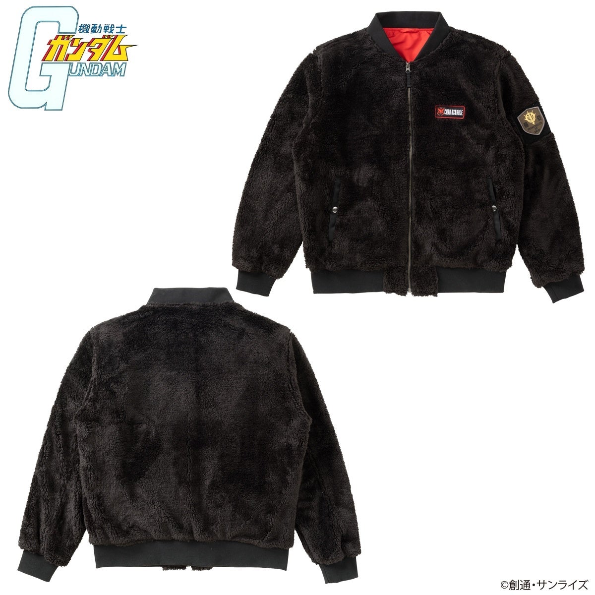 「ボアブルゾン」は、「地球連邦軍モデル」、「シャア・アズナブルモデル」の2種展開です。毛足の長いモコモコとした肌触りが魅力のアイテムです。左胸、左袖にワッペンが付くデザインで、左袖のワッペンは取り外しが可能な仕様です。気分によってワッペンの付け替えが可能です。