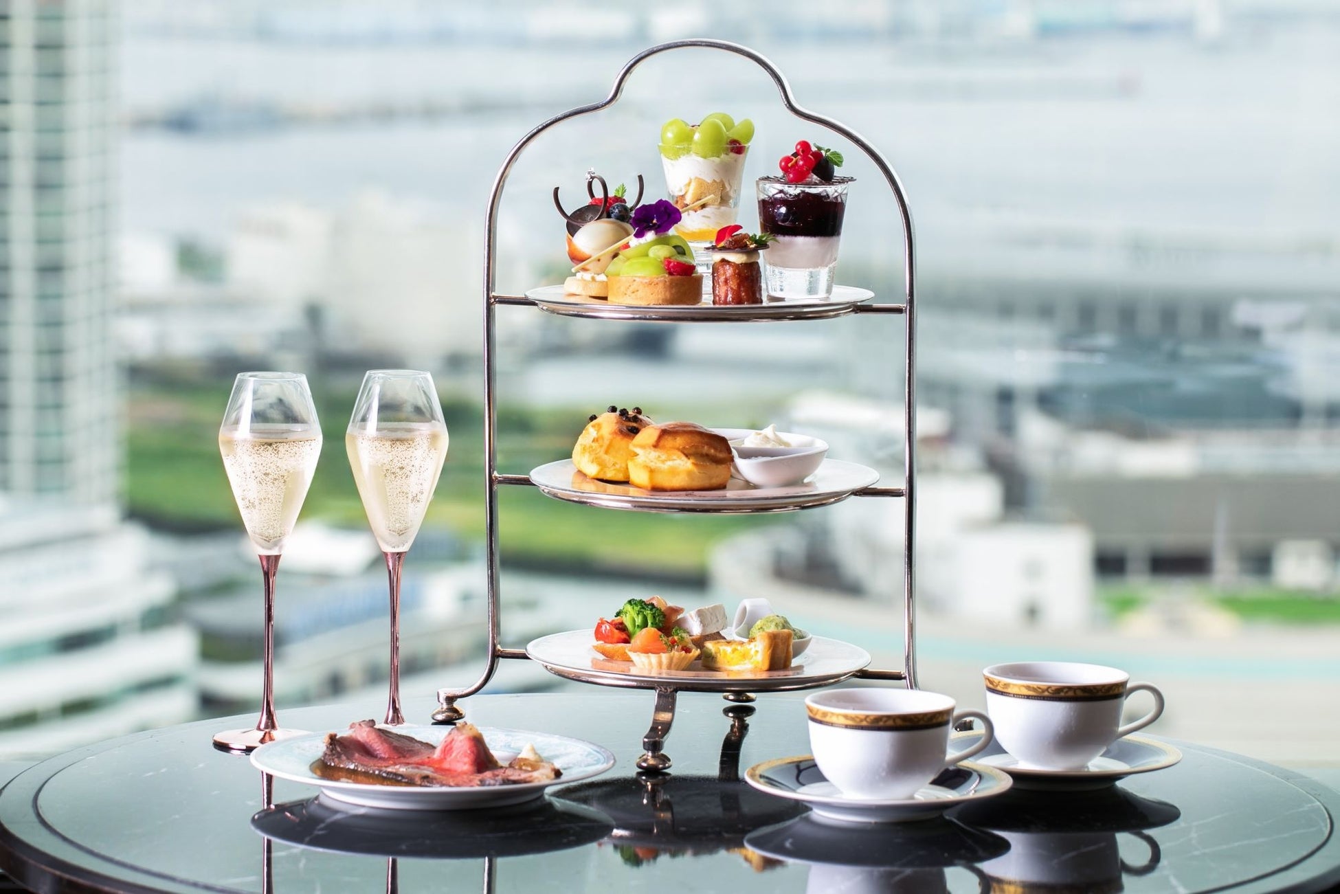 シャインマスカットとピオーネが主役 横浜港を一望しながら旬の果実とローストビーフを味わうアフタヌーンティー