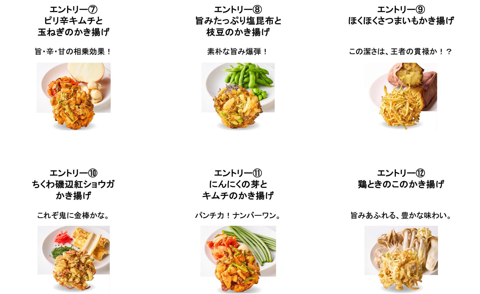 丸亀製麺ではこれまで、季節ごとに三つ葉を使ったかき揚げなど色々なかき揚げを販売してきており、過去販売したかき揚げは50種類以上。その中から、今回は厳選した25種のかき揚げを選抜。25種の中から味わってみたいかき揚げにぜひ投票し、実際に店舗でお召し上がりいただけたらと思います。