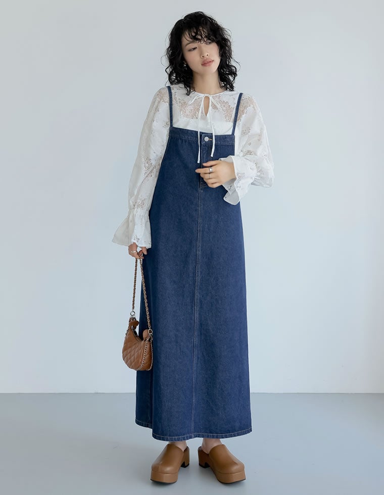 定番の春デニムも、レースブラウス×ジャンパースカートで華やかにまとめて