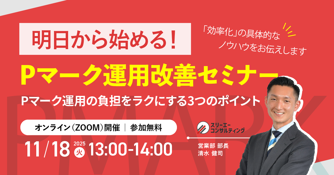 【11/18(火) 13:00-14:00開催】Pマーク運用の「ムリ・ムダ」から卒業!明日から【即実践】Pマーク運用改善セミナー ~ 専門家が伝授!ムダを削り、効果を最大化する3つの秘訣 ~