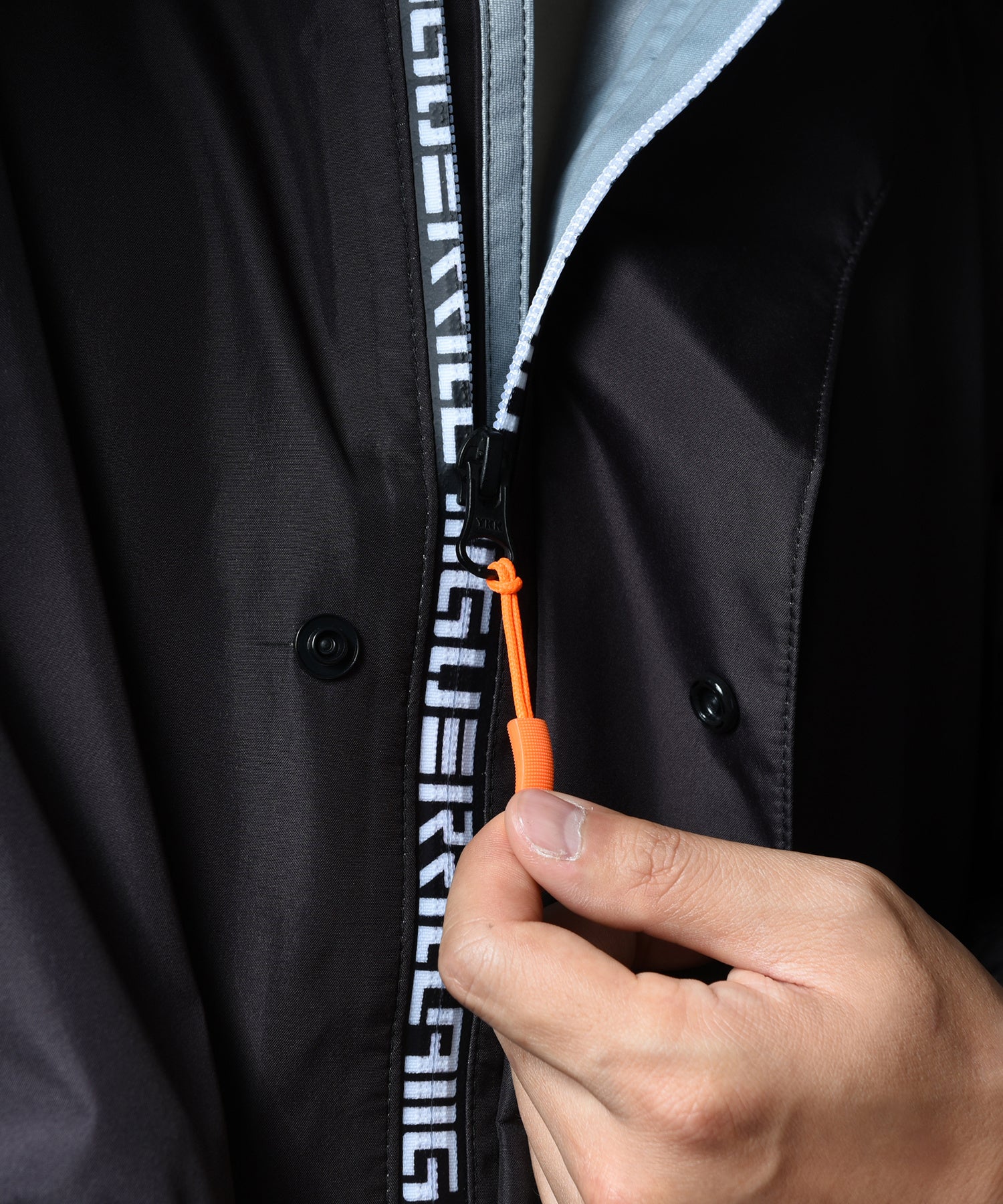 ・機能/特徴: 耐水圧20,000mmH20、透湿性25,000g/㎡・24hの三層構造生地AETX-TECHを採用。表面、中間層、裏面の3層を一体化することで高い防水性、通気性、耐久性を実現。フロントはボタン付きのフルジップ(全開前開き)仕様で、更に防水性が向上。袖口の調整が可能な仕様により、水の侵入を軽減。夜間の視認性を考慮し、前たて部分、フード周り、背面の裾部分にロゴをリフレクタープリント。専用の収納袋が付属。