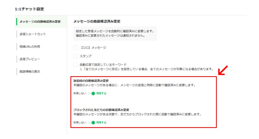 これらの設定をオンにすると、チャット返信時や友だちにブロックされた際に自動でメッセージを確認済みにできるため、メッセージ管理の手間を大幅に削減できます。