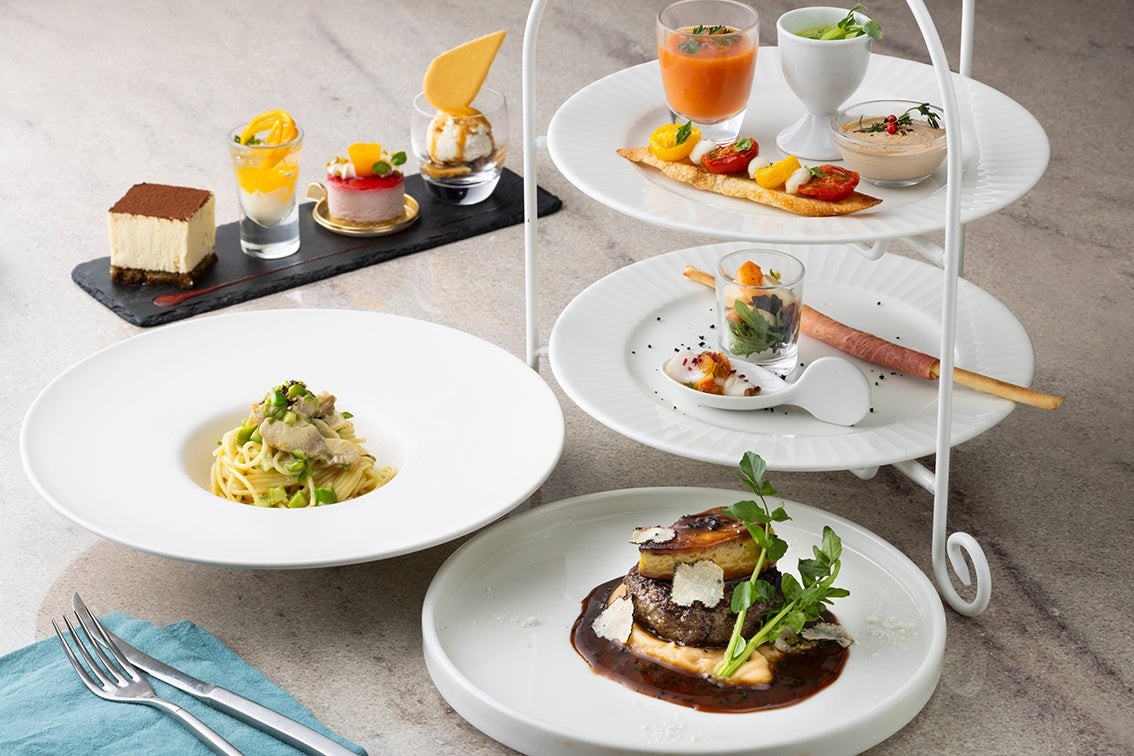 ホテル最上階で、澄みきった青空を眺めながらの絶景イタリアンランチ。開業25周年を記念した平日15食限定の「和牛ハンバーグ炭火焼き フォワグラ・トリュフソース」はおすすめのメインディッシュ。シェフのスペシャリテであるパスタをはじめ、選べるメインディッシュ、デザートまで贅沢なお昼のひとときをお過ごしいただけます。