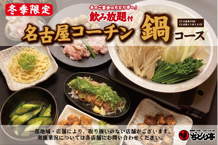 2024年11月下旬より、冬季限定の宴会コースを実施!地鶏の王様ともいわれる名古屋コーチンを贅沢に味わえる「名古屋コーチン鍋コース」や、お得な「選べるぢどり亭鍋コース」はどちらも飲み放題付き♪ぜひ年末のひと時を、ぢどり亭でお過ごしください。