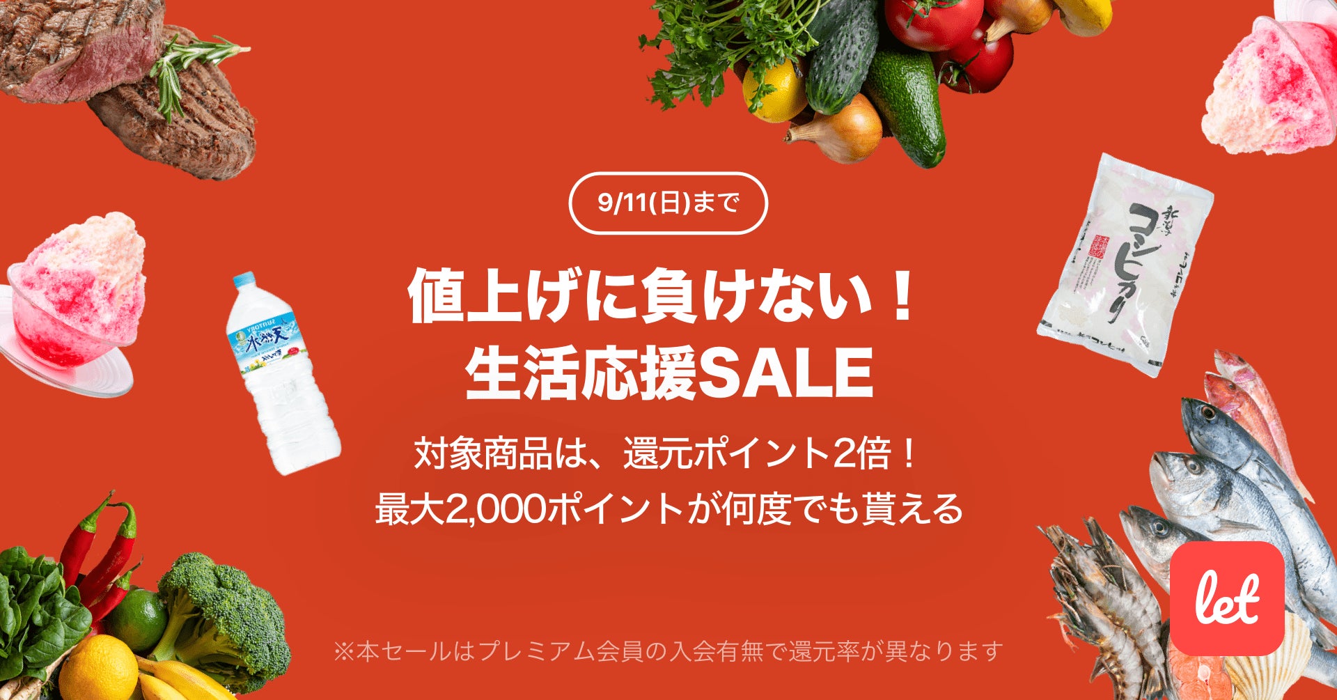 株式会社レット(本社:東京都港区、代表:佐藤 航陽)が運営する、食品ロス/在庫ロス削減のマーケット「Let(レット)」内で「値上げに負けない!生活応援SALE」を9月9日(金) 18:00より開催します。期間中、プレミアム会員様限定で対象の食品をご購入いただくと、2,000ポイントを上限に還元ポイントが2倍になります。期間中のご購入であれば、ポイント還元はお一人様あたり何度でもご利用いただけます。