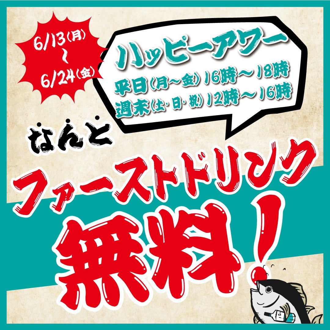 平日16時~18、土日祝は12時~16時の時間帯にご来店のお客様、ファーストドリンク無料!その後しっかり飲み放題も0円
