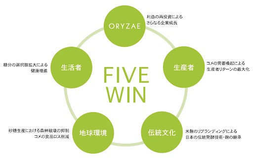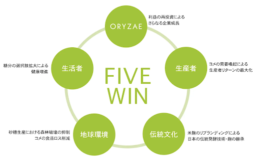 米麹由来発酵糖分「ORYZAE」によって、生活者・生産者・地球環境・伝統文化の課題解決と価値提供、それによる利益を投資して企業成長を目指す”5方よし”の実現を目指している。