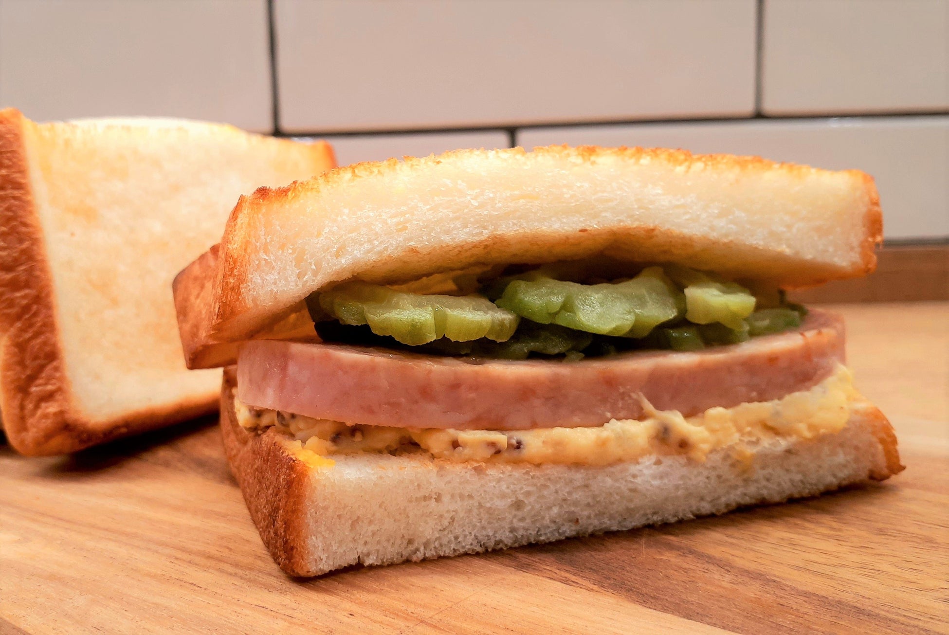 沖縄県民のソウルフードポークランチョンミート「SPAM」と軽くソテーしたゴーヤと卵を生食パンでサンドして焼きあげました。