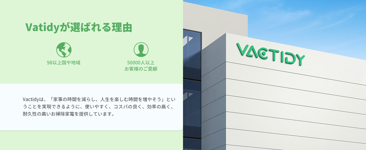 VactidyはProscenic株式会社の子会社であり、「お客様にコスパ最高のサービスを提供」をモットーに、2013年に設立された以来、スマート家電の分野で開発・販売事業に取組んで参りました。