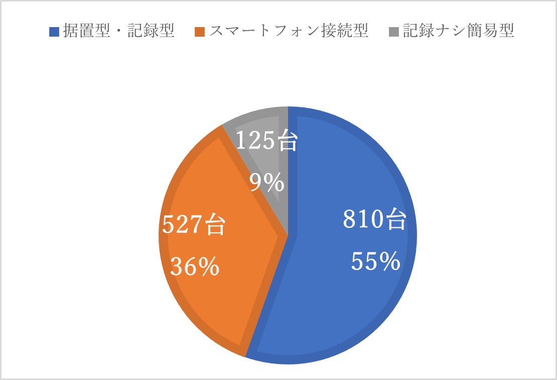 現在利用されている1,462台のうち約55%がPCや印字式等の「記録式アルコール検知器」(設置型・記録型は、プリンタ型とPCタイプの合計)、36%(527台)がスマートフォン接続型アルコール検知器となっています。