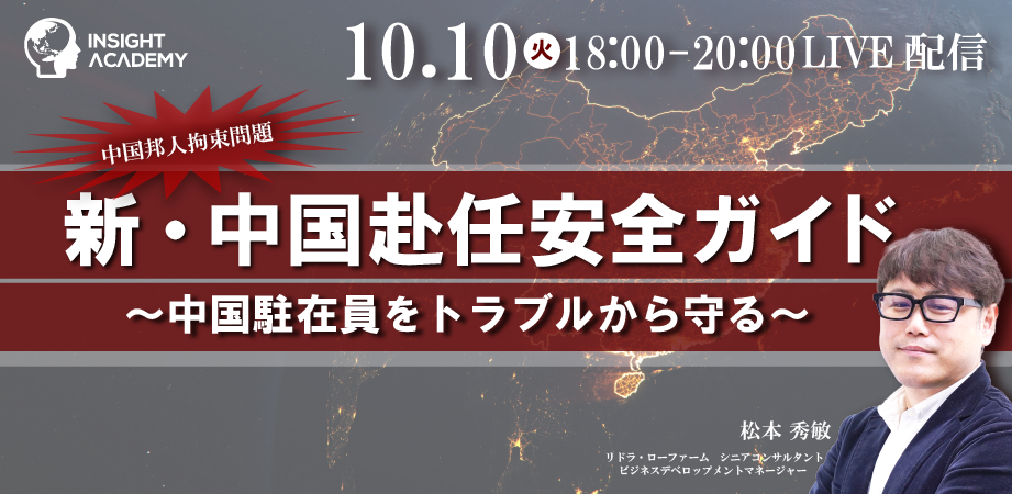 【10/10(火)開催セミナー】中国邦人拘束問題から考える「中国駐在員をトラブルから守る ”新・中国赴任安全ガイド”」