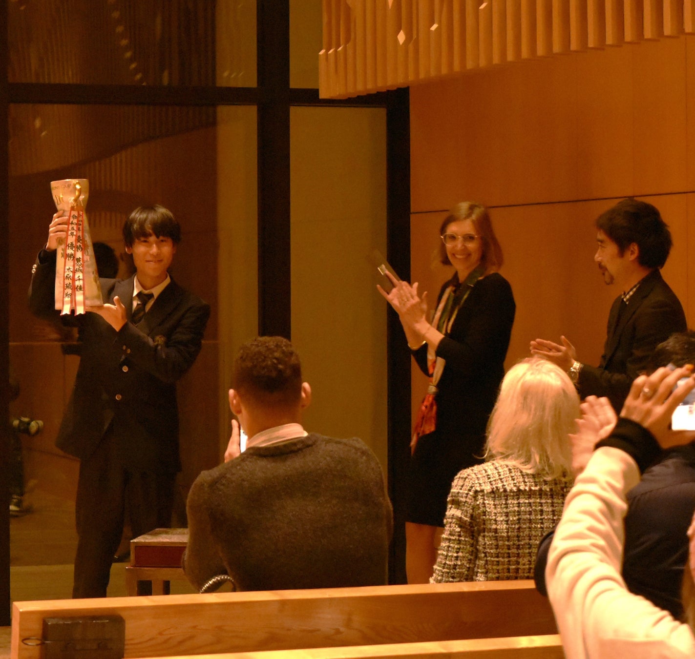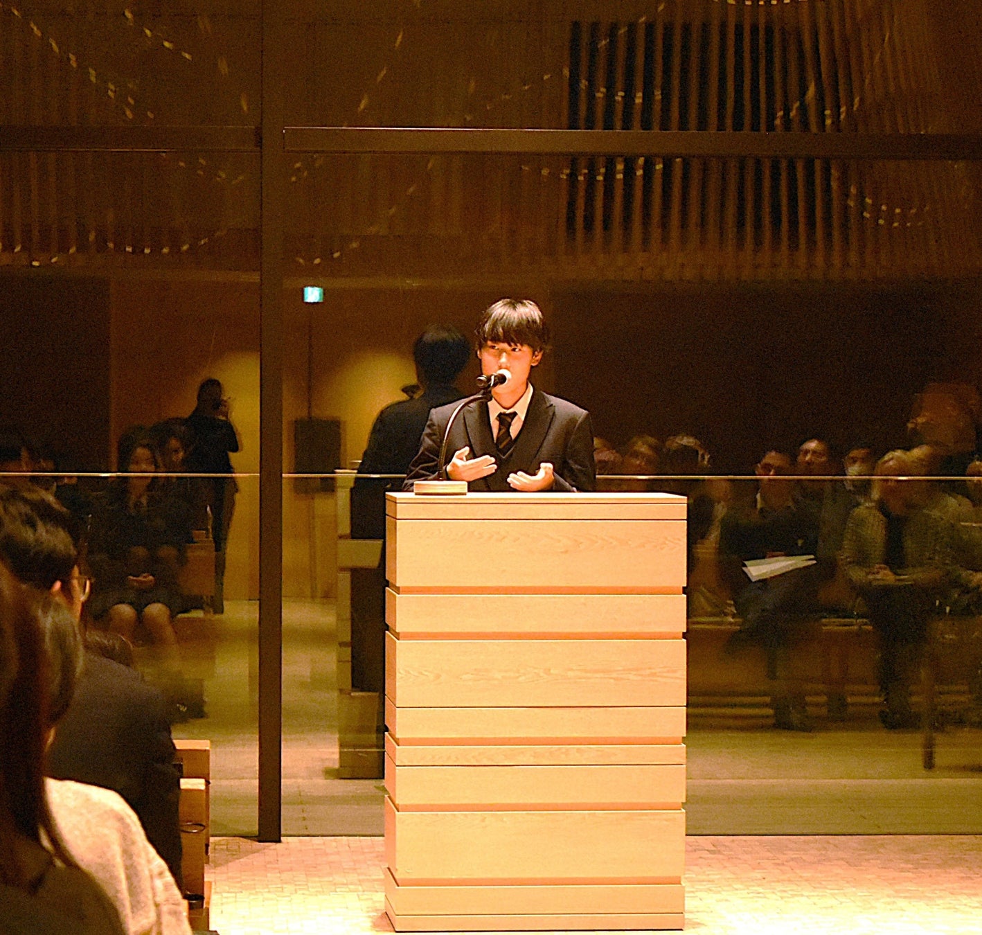 また、ゲストスピーカーとして、第18回日吉ケ丘レシテーションコンテスト(英語による暗唱)で優勝した京都市立桃陵中学校の生徒も出席し、暗唱を行いました。