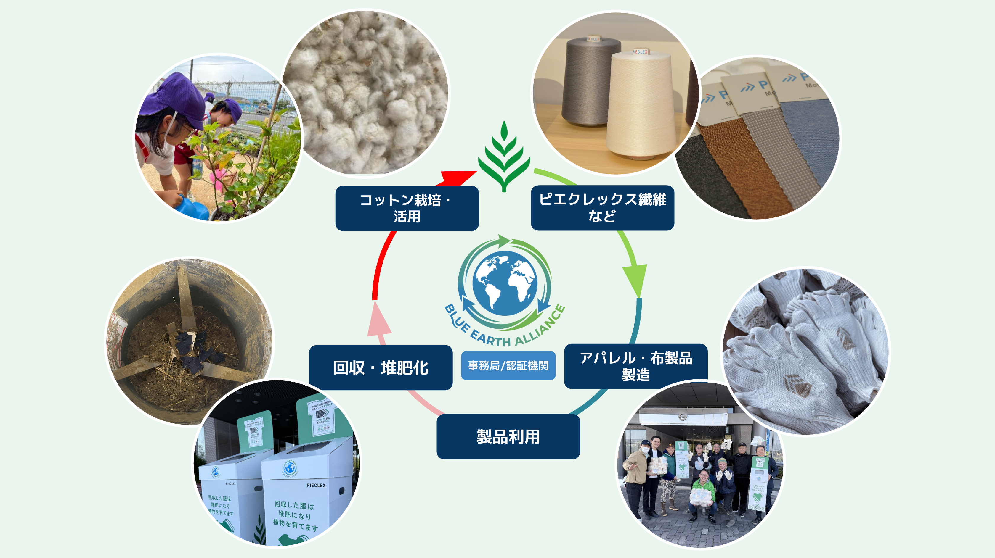 衣類廃棄と耕作放棄地という2つの社会課題の同時解決を目指し、「地着・地消・地循」の地域完結型・資源循環モデルを推進する協議会。P-FACTS製品を軸に、コットン栽培から製品化、使用、回収、堆肥化、そして再び農業へという循環の輪をつなぐプラットフォームとして、企業・自治体・団体の参画を促進している。
