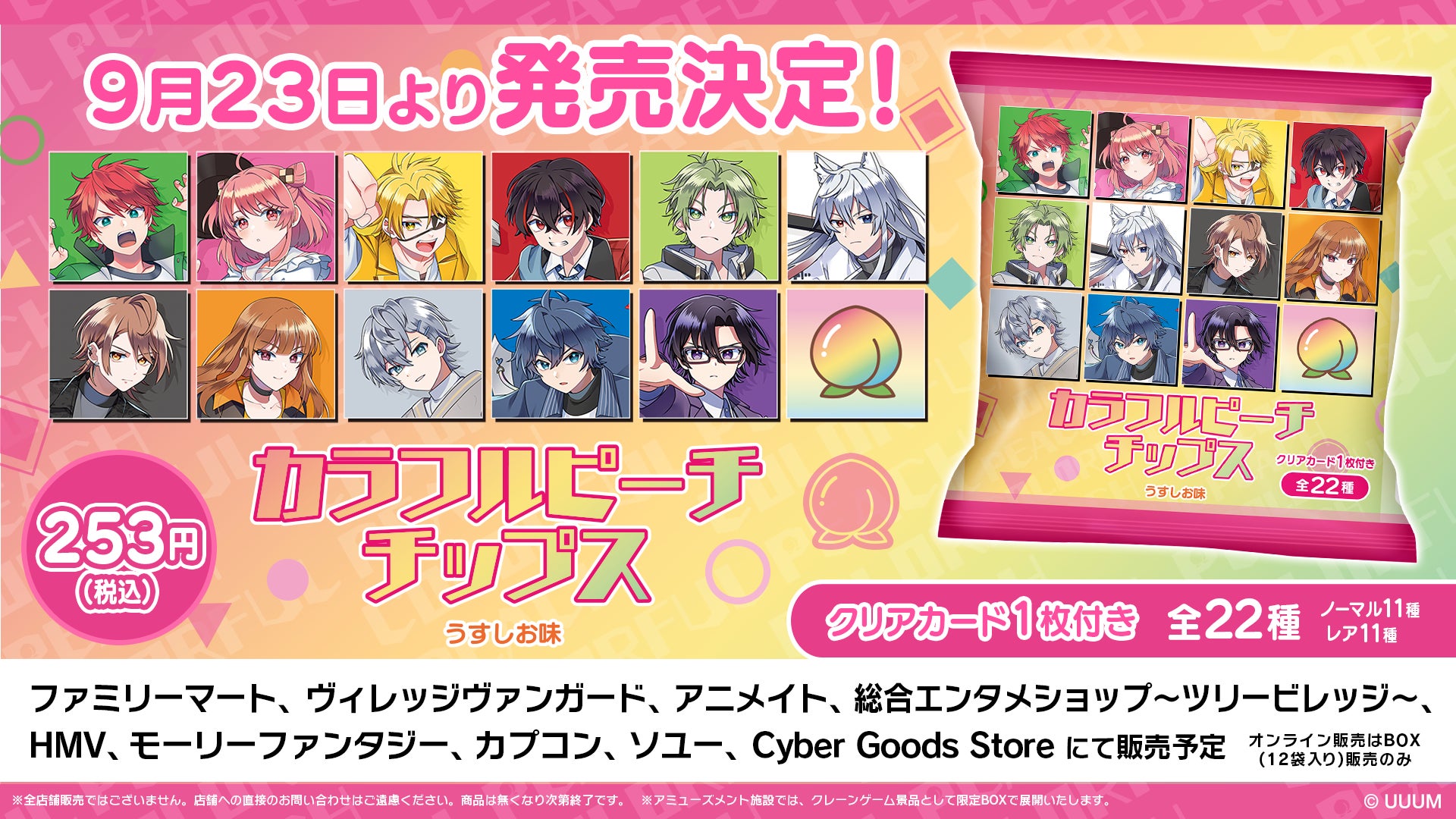 このたび発売が決定した『カラフルピーチチップス うすしお味』では、ゲーム実況グループ「カラフルピーチ」の個性豊かなメンバーたちが描き下ろしイラストとなって登場。全22種類のオリジナルカードがランダムで1枚封入されています。