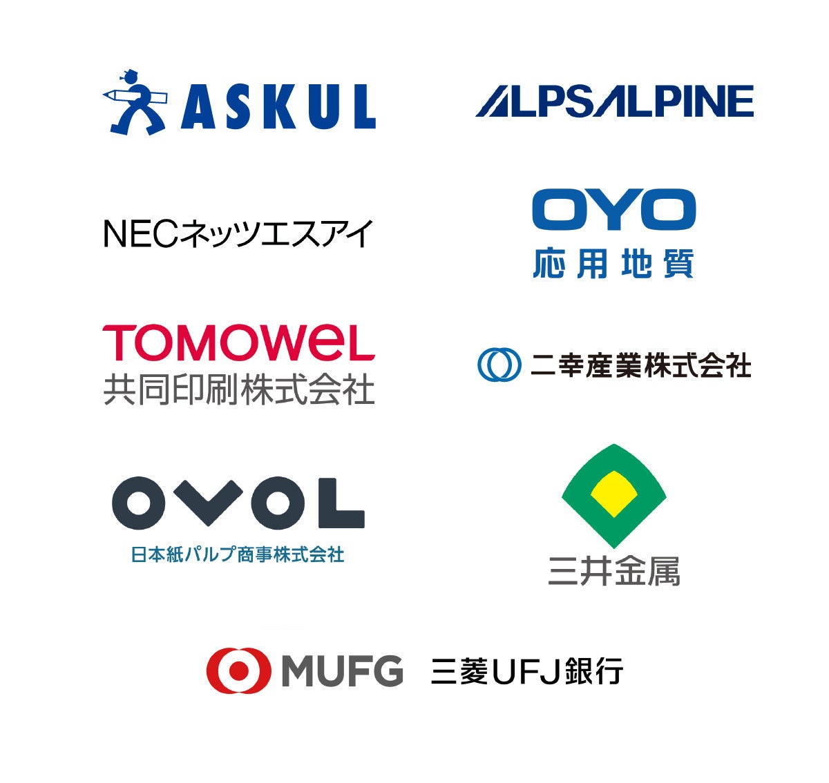アスクル株式会社、アルプスアルパイン株式会社、NECネッツエスアイ株式会社、応用地質株式会社、共同印刷株式会社、二幸産業株式会社、日本紙パルプ商事株式会社、三井金属株式会社、株式会社三菱UFJ銀行