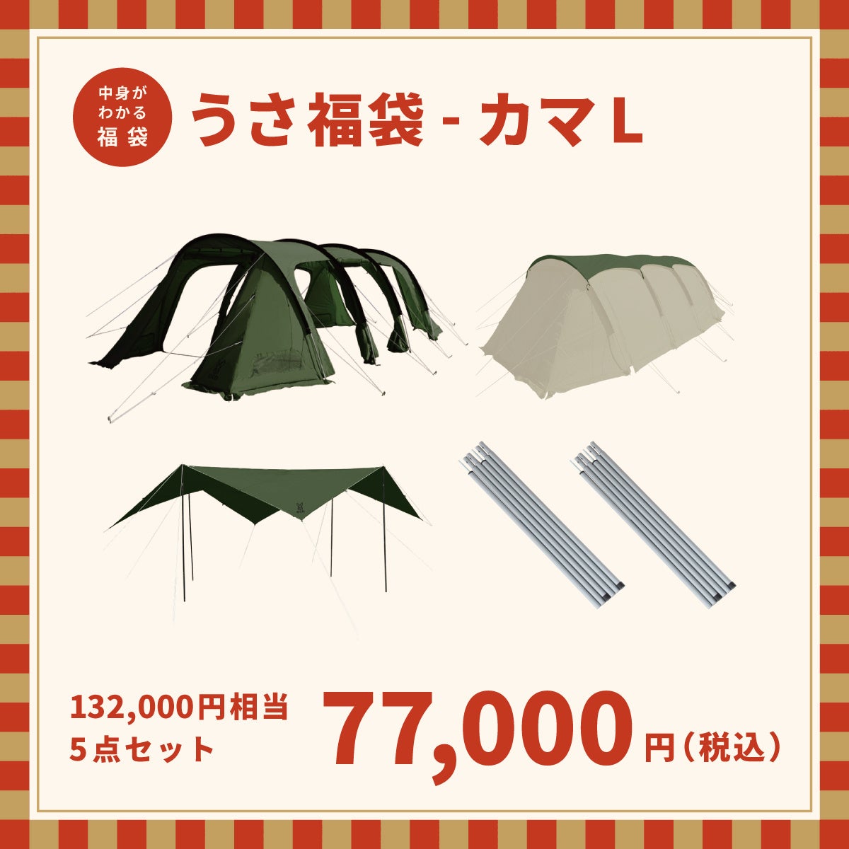 今年の福袋は全部で9種展開。目玉はシェルターテント「ヨンヨンベースTC」(参考価格55,000円)、エアマット「ソトネノキワミL」(参考価格30,690円)、寝室用小型テント「ワンタッチカンガルーテントS」(参考価格20,460円)2点、「テキーラテーブル」(参考価格17,380円)の5点がセットになった「うさ福袋-ヨンヨン」。総額14万円相当の豪華セットを44,000円(税・送料込)の特別価格で販売いたします。