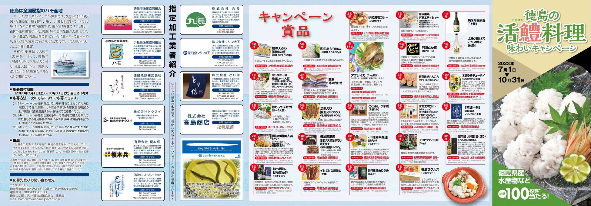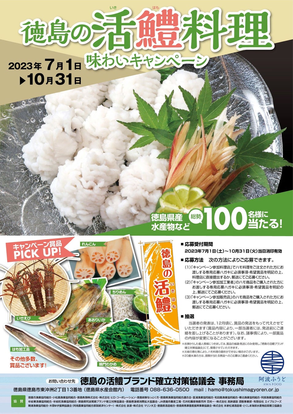 徳島の活鱧ブランド確立対策協議会では、徳島県内外の29の料理店でハモ料理をご注文いただいた方、徳島県内の10の加工業者または、徳島県内外の15店舗の販売店でハモ商品をご購入された方の中から、抽選で100名様に、徳島県産農畜水産物などが当たる「徳島の活鱧料理 味わいキャンペーン2023」を開催します。