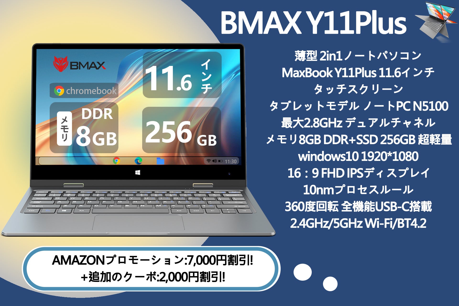 【9,000円値下げ、16台限定】BMAX Y11Plus 2in1 ノートパソコン、8G+256G、ノートPC N5100、専用の追加クーボンを配布中❢ 期間限定、無料で手に入れよう!