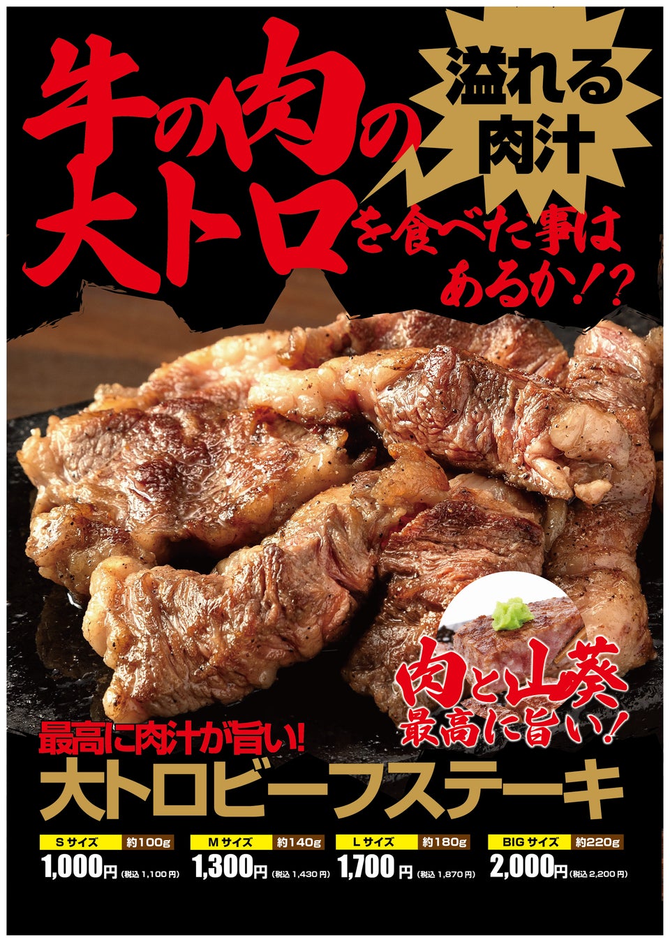 ■「とろけるハラミ」「大トロビーフステーキ」「旨味牛赤身ステーキ」が1000円!!