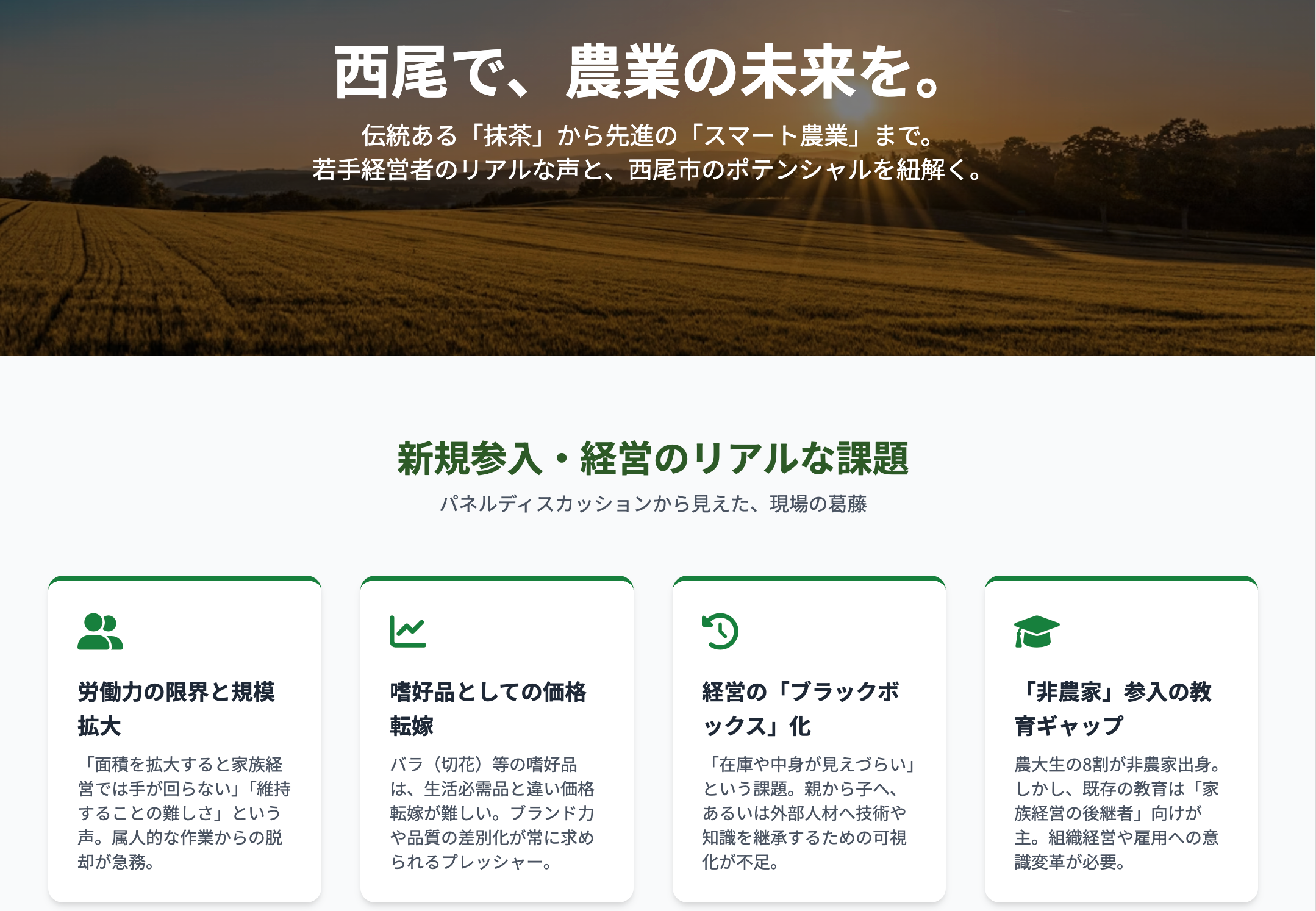 当社はAIを、単なる効率化ツールではなく、農家の皆様の想いや技術をさらに輝かせる「現代の新しい道具」と定義しています。事務作業や複雑な分析といった「周辺業務」をAIというパートナーに委ねることで、浮いた時間を「土と向き合う時間」や「職人としての価値を最大化する活動」に充てることが可能になります。本フォーラムでは、西尾市のリーダーたちと共に、AIを味方につけることで、農業がより創造的で、誇りを持って次世代に繋げられる産業へと進化する姿を提案しました。