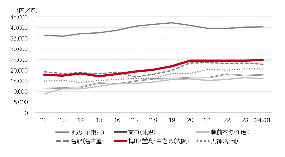 <募集賃料の推移(6大都市 大規模ビル・主要駅前地区)>