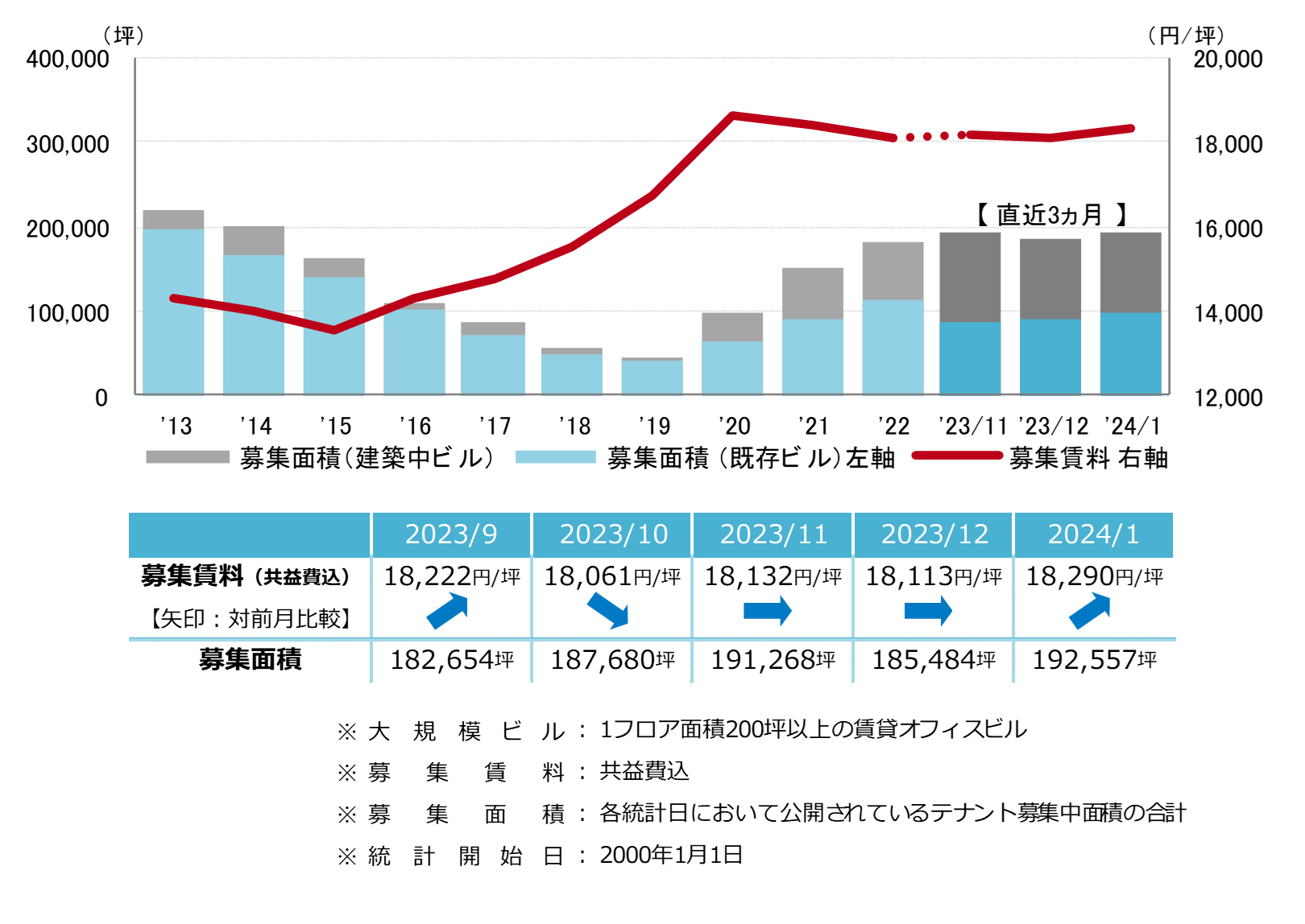 募集賃料は前月比プラス177円/坪の18,290円/坪となった。前月から小幅に上昇したものの、18,000円/坪台前半での横ばい傾向が続いている。