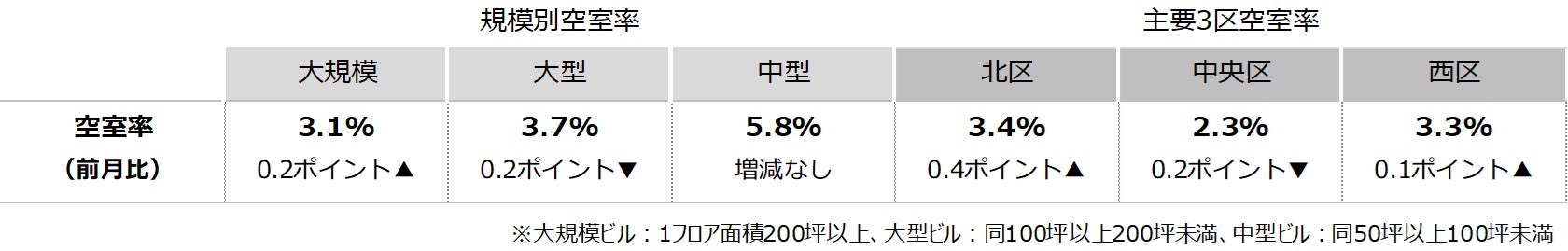 空室率は前月比プラス0.23ポイントの3.09%と、7ヵ月ぶりで上昇した。複数の新築ビルが空室を抱えて竣工したことが空室率の上昇要因となっている。潜在空室率は前月比プラス0.70ポイントの5.17%と、大幅な上昇となった。